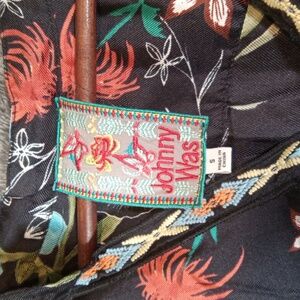 Johnny Was Black Floral Blouse Tunic Silk Embroider Trim Vacation Resort Womens