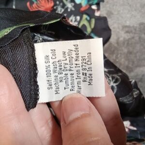 Elegant black blouse with vibrant floral designs. Features intricate patterns in red, green, and cream. Johnny was Tunic blouse. it's 100% silk..in great condition no stains or holes ..measurements are in the pictures...plz see measurements for best fit ..size small