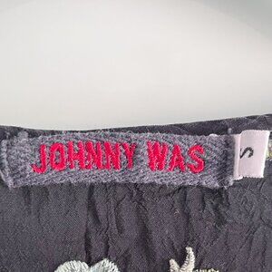 This authentic, high-end Johnny Was piece is a must-have for the bohemian and artsy wardrobe! Made from luxurious 100% Cupra Rayon fabric, this flowy garment is designed for comfort and elegance. The black background provides the perfect canvas for the brand's signature intricate floral embroidery in beautiful shades of pink, coral, blue, and green.
