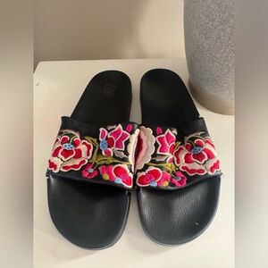Johnny Was Black Sandals with Pink Floral Embroidery