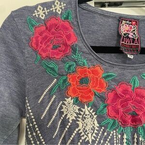 This is a fabulous Johnny Was short sleeve blue tunic. It has a slight scoop neck and the neck has red and orange flowers outlining it. The front of the shirt has a stitched white geometric, boho design. The shirt is made of a cotton and polyester blend and is a size XS.