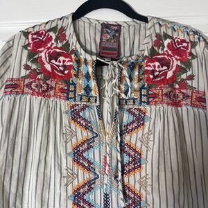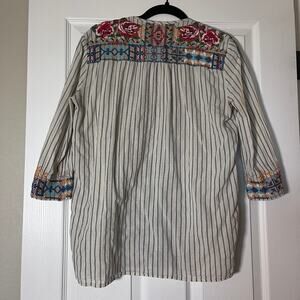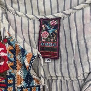Johnny Was Blue Stripes Embroidered Boho Indie Blouse Top Size XS