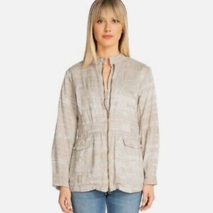 Stylish textured tan jacket with a zip closure. Features two front pockets.