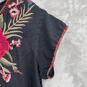 Johnny Was Burke tunic dress in black with multi-colored floral embroidery on front & back. Kimono sleeves. Material is 100% linen. Size M. Please see photos for measurements.