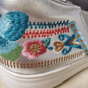 'Vinny" Shoe. Gorgeous silver embroidered shoe by Johnny Was. Such detail and well made! Silver Leather! Easy slip on and off. Removable footbed pad. Rubber sole. Should clean up like new! Excellent condition! Ask me any questions!!