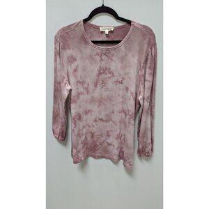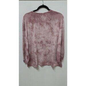 Johnny Was CALME Light Purple Tie-Dye Blouse. Size Large. Gently used, with minor spot stains. It has long sleeves with elastic cuffs, some rolling to the cuffs, and a rounded neckline.