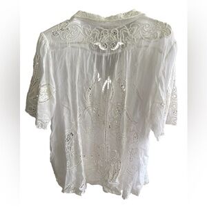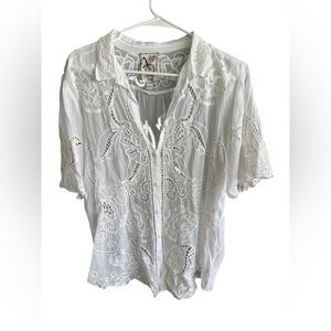 The Chryssie blouse from Johnny Was features intricate floral embroidery and openwork detailing. Short sleeves and a spread collar finish the piece. Spread collar Short sleeves Button-front closure 100% rayon Hand wash