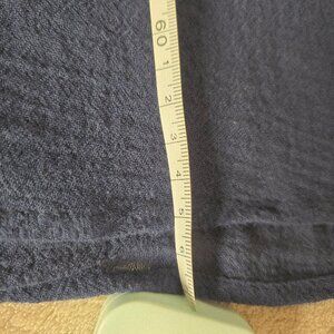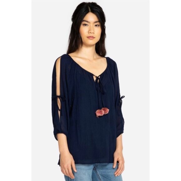 Johnny Was Calme Navy Blue Cold-Shoulder Boho Peasant Blouse with Cami & Pom-Pom Tie — Women’s Size S, split cold-shoulder sleeves, 3/4 tie cuffs, and a coordinating cami underlayer. In excellent condition without any flaws.