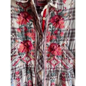 Preowned and in EXCELLENT Condition Johnny Was Candice Smock Plaid Floral Button Up Embroidered Ladies Medium Top/Shirt/Blouse. There is a small discoloration just after the very last button. It is very faint and hard to notice. This shirt is sold out online.
