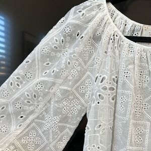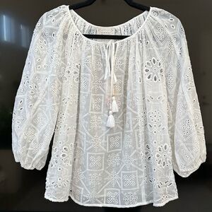 Johnny Was Castillo Eyelet Embroidered Top Blouse White Semi-Sheer