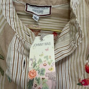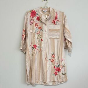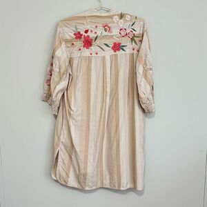 Decorated with floral embroidery, Johnny Was' Cherri stripe tunic dress is crafted of cotton. This loose-fitting style features a mandarin collar, three-quarter-length sleeves, and a single patch chest pocket.