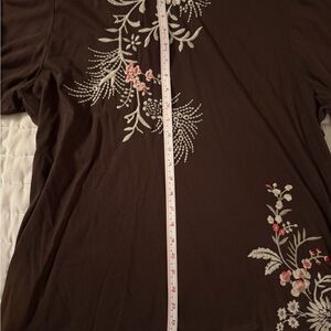 Chic chocolate blouse with delicate floral embroidery. Soft and stylish design.
