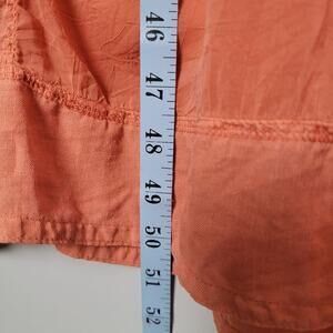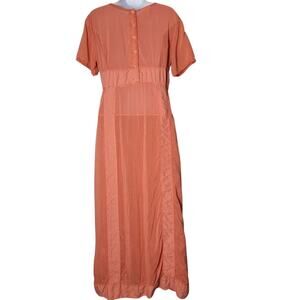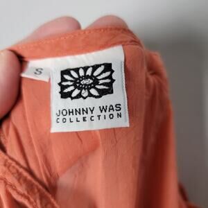 Johnny Was Collection women’s maxi dress in a soft orange color, size Small. Made from 100% rayon with 100% linen trim. Features short sleeves, V-neck, empire waist, and a half button-up back. Measures approximately 17.5” pit to pit and 50.5” in length. Lightweight and flowy design perfect for warm weather wear.