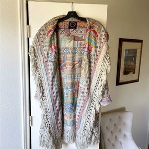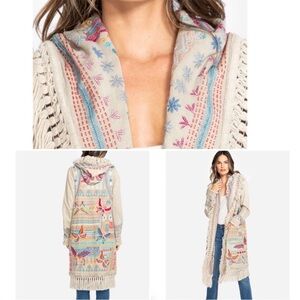 Johnny Was Cyrillus Embroidered Hooded Duster Coat Fringe Boho Truffle XS EUC