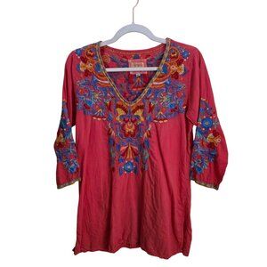 Johnny Was Deep Coral Embroidered V-neck 3/4 Sleeve Tunic Top Size S