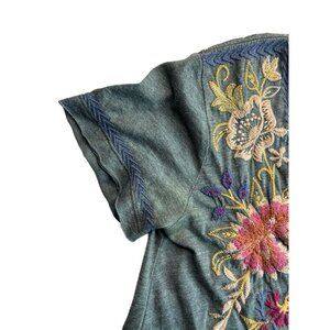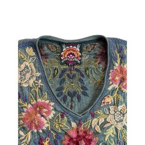 Johnny Was Dress Adeline Tunic Draped Floral Embroidered V-neck Blue, Sz Small