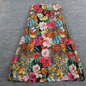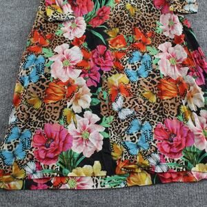 Features a vibrant allover print with large colorful flowers, butterflies, and leopard spots