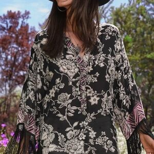 Chic black kimono with vibrant floral design. Features fringe accents.