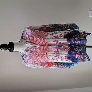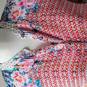 Pre-owned, this 100% rayon, stunning floral design in a mix of colors, long sleeves, banded collar, button-up blouse is in excellent condition with no holes, no stains, and no snags. Perfect for adding a pop of color to your wardrobe.