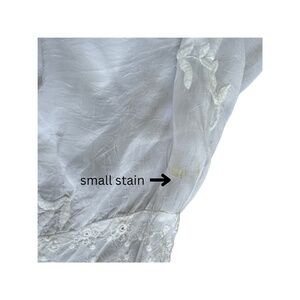 - Sheer cupro fabric with embroidery, split v-neck, long roll-tab sleeves, tunic length, relaxed fit, size