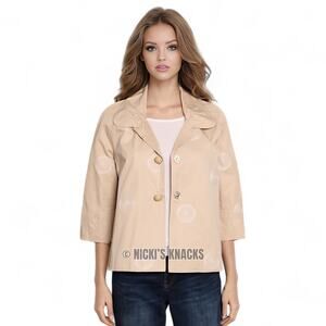 Refined and artistic, this Johnny Was tan embroidered blazer in size Small brings boho sophistication to any outfit. Crafted with a structured cotton shell and swirl dot embroidery throughout, it features a gathered collar, 3/4 sleeves, and two snap closures with decorative buttons. Fully lined and lightweight — ideal for layering across seasons.