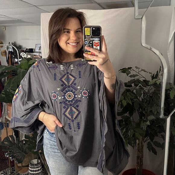 Johnny Was Embroidered Boho Poncho Top Gray Size Medium