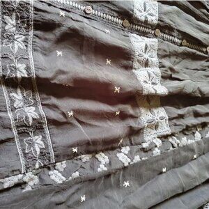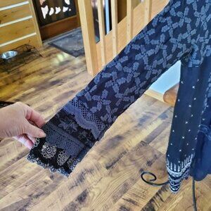 EUC...Unique with very, very minimal wear that has no holes or tears, just beauty and uniqueness. In almost brand new condition. Chic tier sleeve cuffs, with a Dark Navy almost black appearance that cascades eyelet appearance accents with unique embroidery front and back. This has no attached lining. Can be worn as a dress or a coat. Check out all the pictures for details and approximate measurements.