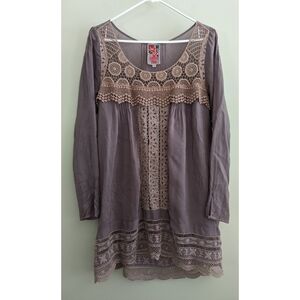 Very good pre-owned condition. Johnny Was Embroidered and crocheted dress. Fabric tag is out but this is classic Johnny Was Cupra Rayon. Size XS