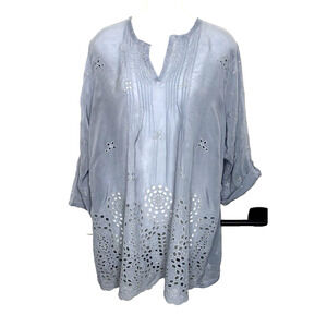 JOHNNY WAS EMBROIDERED EEYELET BLUE TUNIC TOP BOHO TUNIC