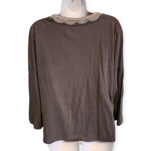 Beautiful oversized Boho long sleeve embroidered top from Johnny Was. Grey v-neck with a lace up neckline. Features a lot of intricate embroidery. 100% cotton.