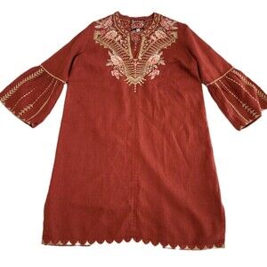 Johnny Was Embroidered Floral Terracotta Boho Linen Tunic Dress READ INFO SZ S