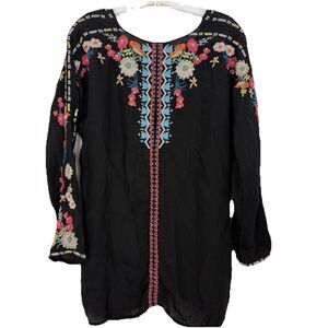 Johnny Was Embroidered Tunic Top Blouse Womens Sz Small Black Boho Long Sleeves