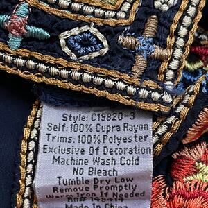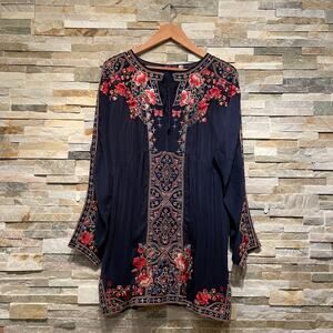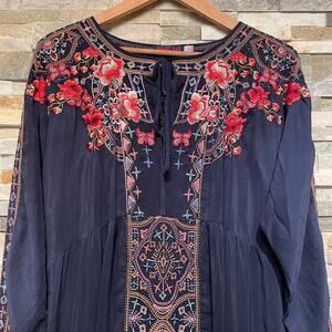 Johnny Was Embroidered Tunic | Navy Boho Folk Top, Romantic Kimono Sleeves Rayon