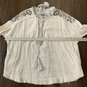 Johnny Was Embroidered White Gauzy Raw Detail Triple Tassel Tunic Top Size Small