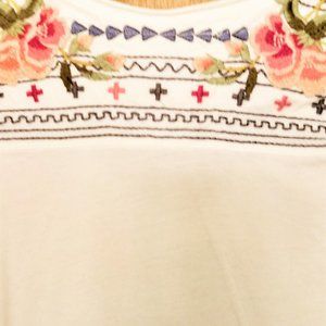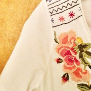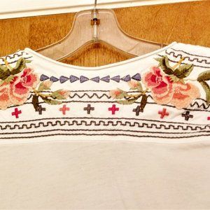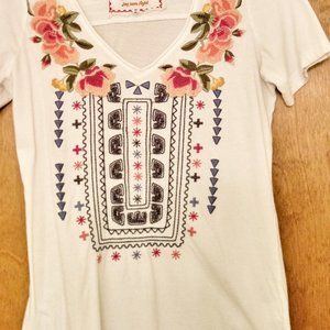 Almost new beautiful Johnny Was White short sleeve tee-shirt with GORGEOUSE shades of pink; ROSES, and a geometric design, From his "JW Los ANGELES" line of clothes. This particular tee-shirt is named "Joy Love Light". It is a soft quality cotton-polyester and can be machine washed and cold-tumble dried. Its a lose Size Small. Its been gently used-worn twice.