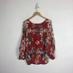 Johnny Was Evy Red Floral 100% Silk Blouse Medium Balloon Sleeve Lightweight