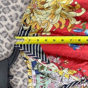 Features vibrant floral botanical mixed pattern with shirred under bodice waist.