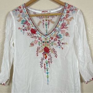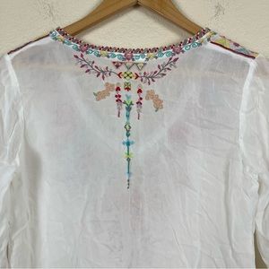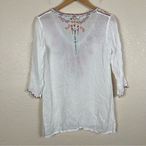 Johnny Was Floral Embroidered Tunic Blouse White Boho Peasant Cottagecore Sheer