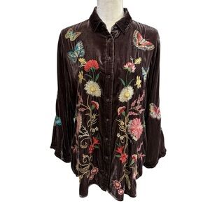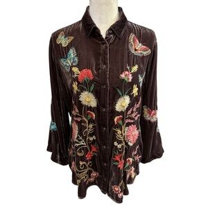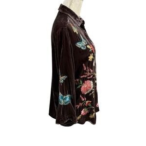 Johnny Was Floral Embroidered Velvet Kimono Sleeve Blouse XS Coffee Bean NWT