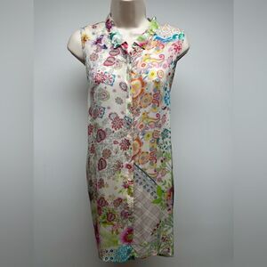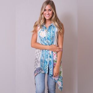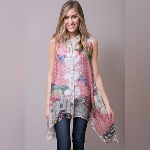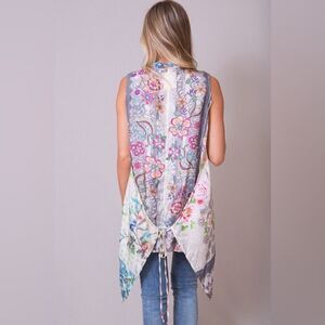 The Wirey Drawstring Tunic made by Johnny Was is a beautiful, colorful sleeveless piece. The collared neck and buttons along the front add a simple classic touch to this floral piece. Wear the ties cinched up on each side or pull them to the back to give a soft draped look. 100% silk. Hand wash in cold water and hang to dry.