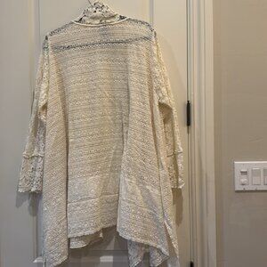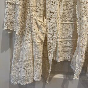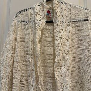 This is a beautiful Johnny Was Flower Tiles Crochet Jacket. This crochet piece is perfect for layering over a dress or tunic, creating a comfortable Bohemian look. There are two front pockets, open draped front and long sleeves. The item must be be special ordered from Johnny Was according to its website. The color is like the first photo. Due to lighting, it looks darker in subsequent photos.