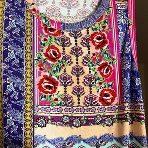 This brand new never worn tank top is made from a luscious, soft, stretchy lightweight fabric that is machine washable and doesn't crease. It measures 18" from pit to pit and 24" from the shoulder to the hem. It is wider at the bottom (why it's called "swing") so it can be more forgiving if you need to hide a bit at the waist. I am selling it because I have no more room in my closet for all my Johnny Was tops!