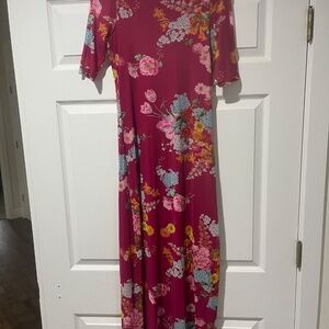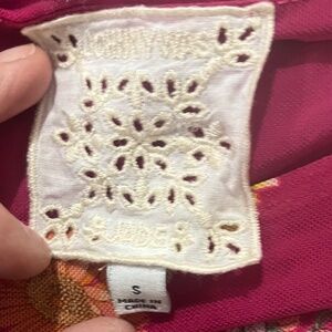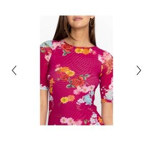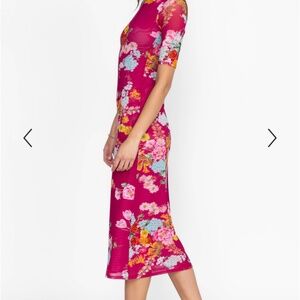 Vibrant Johnny Was GOLDEN BOUQUET MESH MIDI DRESS, size Small. Nylon Spandex, Lined and worn once. Deep pink background with floral design.