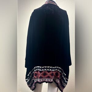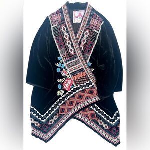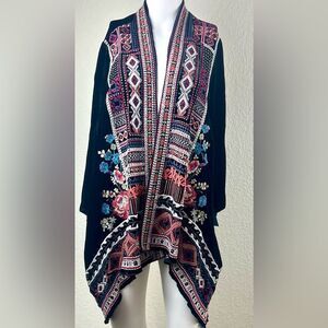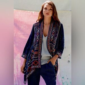 Gently worn Johnny Was Geometric Embroidered Velvet Cardigan. Beautiful embroidered open front velvet 3/4 sleeve cardigan. Black velvet with colorful embroidery. Stock photo is not exact but similar (just used to show fit)