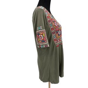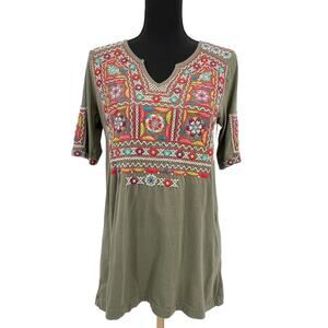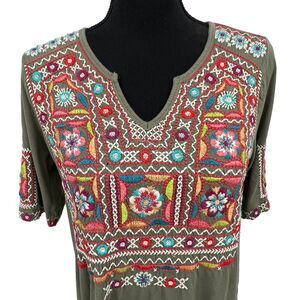 Johnny Was JW Los Angeles Olive Green Floral Embroidered Peasant Blouse Small
