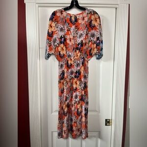 Johnny Was- Jade- Deepika Midi Dress. Size S. Beautiful flowy Orange floral rayon dress with tie front and elastic back waist.