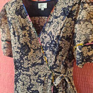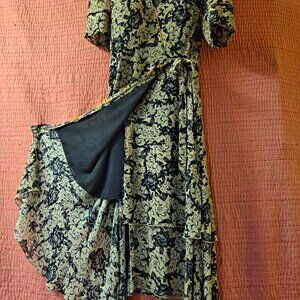 Sophisticated flowing wrap dress in a beautiful navy/beige silk-like chiffon; worn only once; like new; size medium. Slightly scalloped skirt, length 31"-33" from the waist . . . Delicately pin-tucked shoulder areas, front & back.