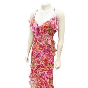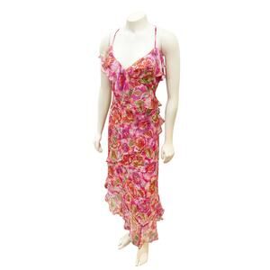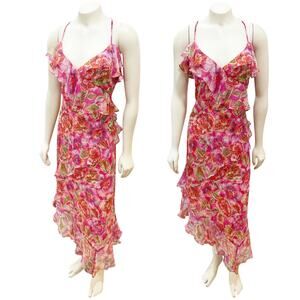 Crafted from 100% flowing silk, the Katella Midi Dress is embellished with a vibrant floral pattern. Featuring a ruffled V-neckline and spaghetti straps this eye-catching dress is finished hidden side zipper and an asymmetrical hemline for visual interest. Pair with strappy heels and a coordinating shawl for a dinner out.