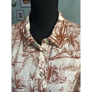 Cream colored long sleeve tiered 100 % cotton dress with a drawn pattern of tigers, snakes, birds, flowers and leaves in brown with embroidered colors on cuffs