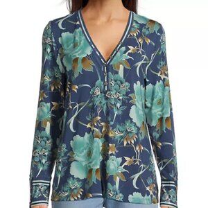Johnny Was Janie Favorite Henley Peonee Long Blue Tee Floral Shirt Top Small NEW